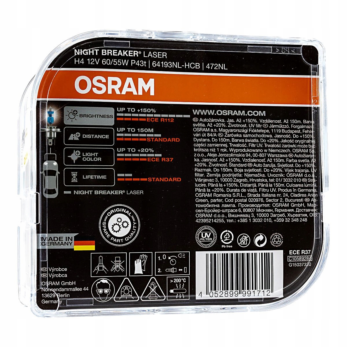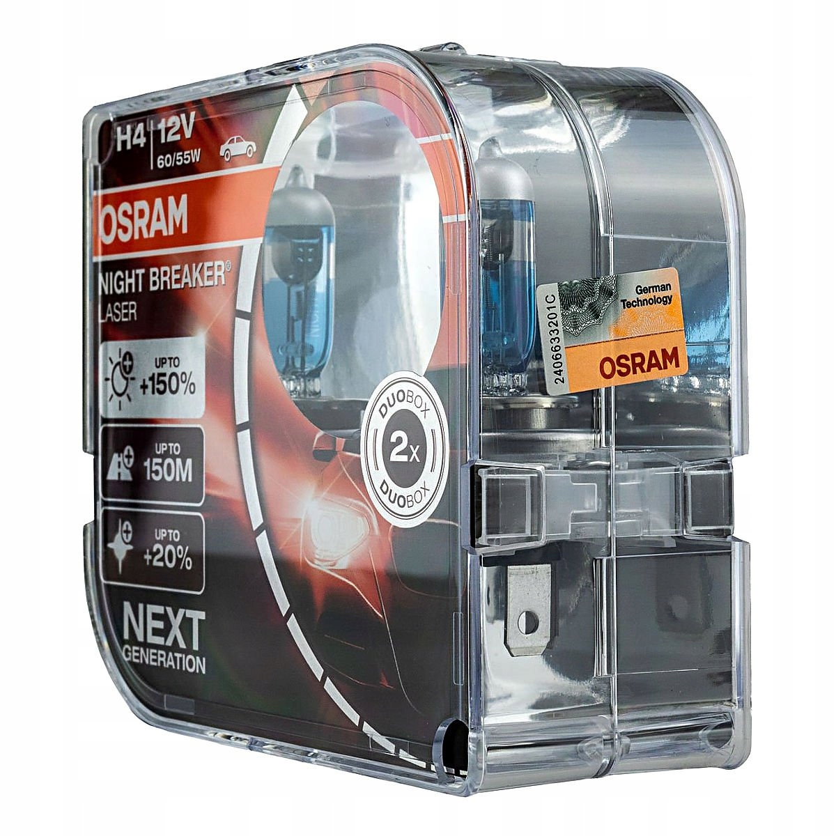 Nowa generacja Night Breaker® Laser ma nowy „okienkowy” kształt w powłoce. Precyzyjny kształt stworzony przez ablację laserową zapewnia maksymalną wydajność. Włókno jest idealnie ustawione, aby zapewnić lepszy rozkład światła.Ponadto wysokie ciśnienie rzadkiego gazu wypełniającego zapewnia wyższą wydajność. Srebrna osłona nadaje samochodowej nalepce atrakcyjny wygląd, a wygrawerowana nazwa NIGHT BREAKER® gwarantuje jej wyjątkowość i natychmiastową rozpoznawalność.